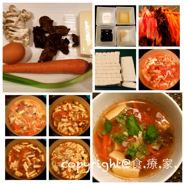 2. 將豆腐切成1公分方,2公分長的方塊,蕃茄, 胡蘿蔔,木耳切絲備用。
